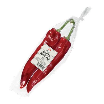 Röd spetspaprika i påse ICA. Nederländerna/Spanien. 200 g. Klass 1. Jfr pris 75:00 kr/kg.