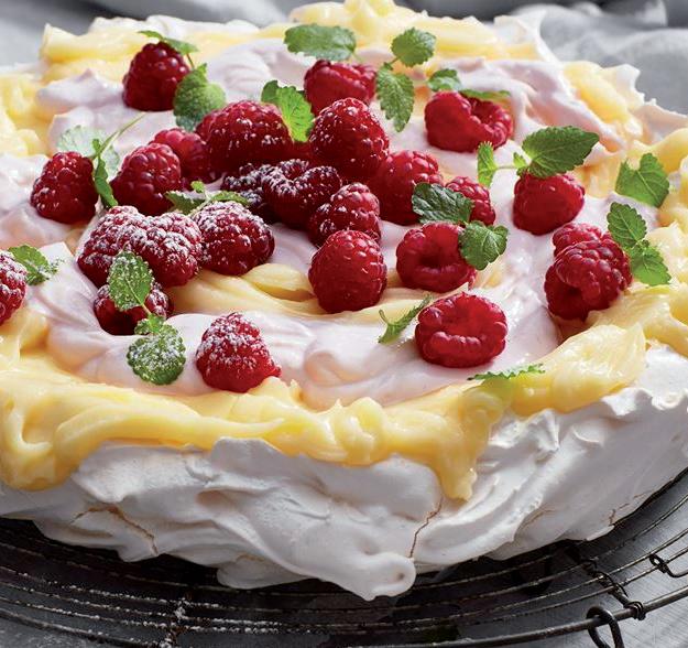 Bred lemoncurd på marängbotten. Klicka på kvarg och toppa med hallon. Pudra över florsocker och garnera med citronmelissblad.