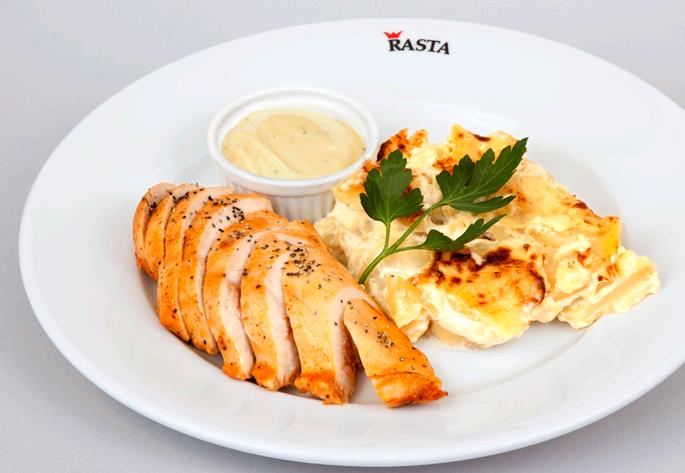 Kycklingfilé med potatisgratäng och bearnaisesås inkl. dryck, kaffe och marängsviss