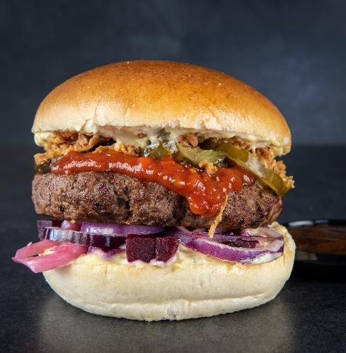 Himmerland bøf, tørsaltet bacon fra Rævhede, ”dobbelt Thise” ost, hvidløgs mayo, salat og tomat relish serveret i friskbagt rustik durum bolle