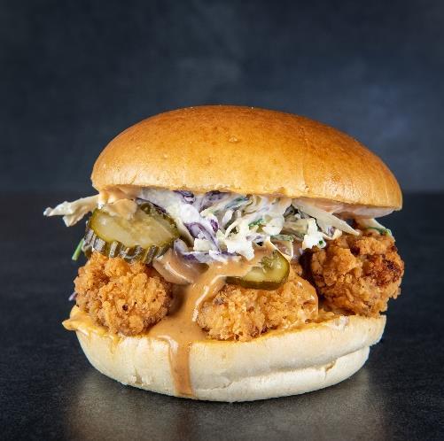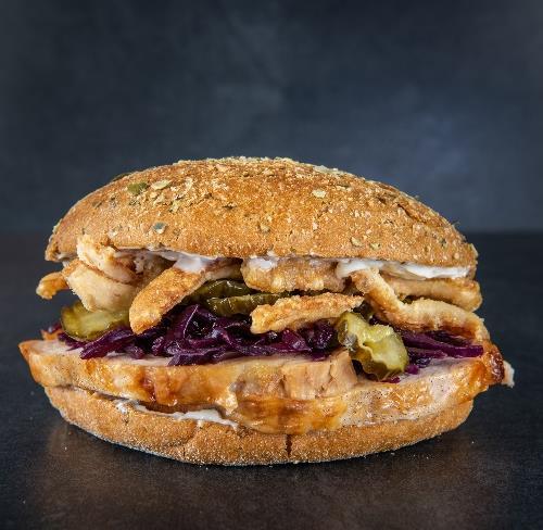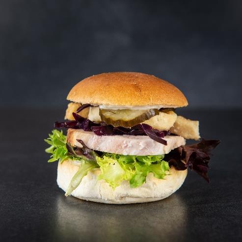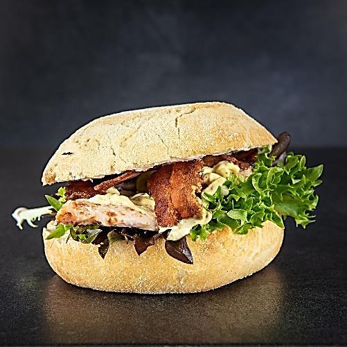 Buttermilk cooked kylling, tørsaltet bacon fra Rævhede Naturprodukter, chili mayo, hjemmelavet spidskålssalat, syltede agurker, tomat relish og MUMS hjemmelavet dressing