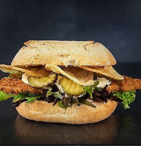 Buttermilk cooked kylling, tørsaltet bacon fra Rævhede, chili mayo, hjemmelavet spidskålssalat, syltede agurker, tomat relish og MUMS hjemmelavet dressing