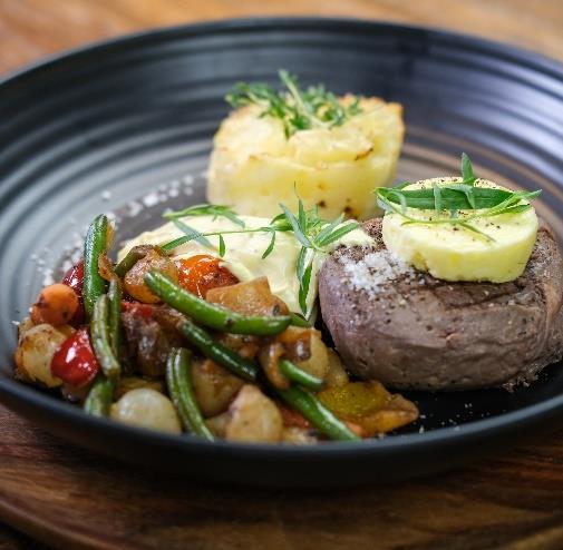 Himmerland oksebøf, saftig grisekam, buttermilk cooked kylling eller en vegetar bøf.