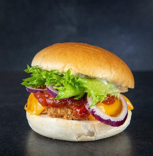 Vegetar bøf, hvidløgs mayo, tomat relish, rødløg, cheddar ost og salat