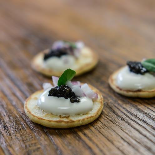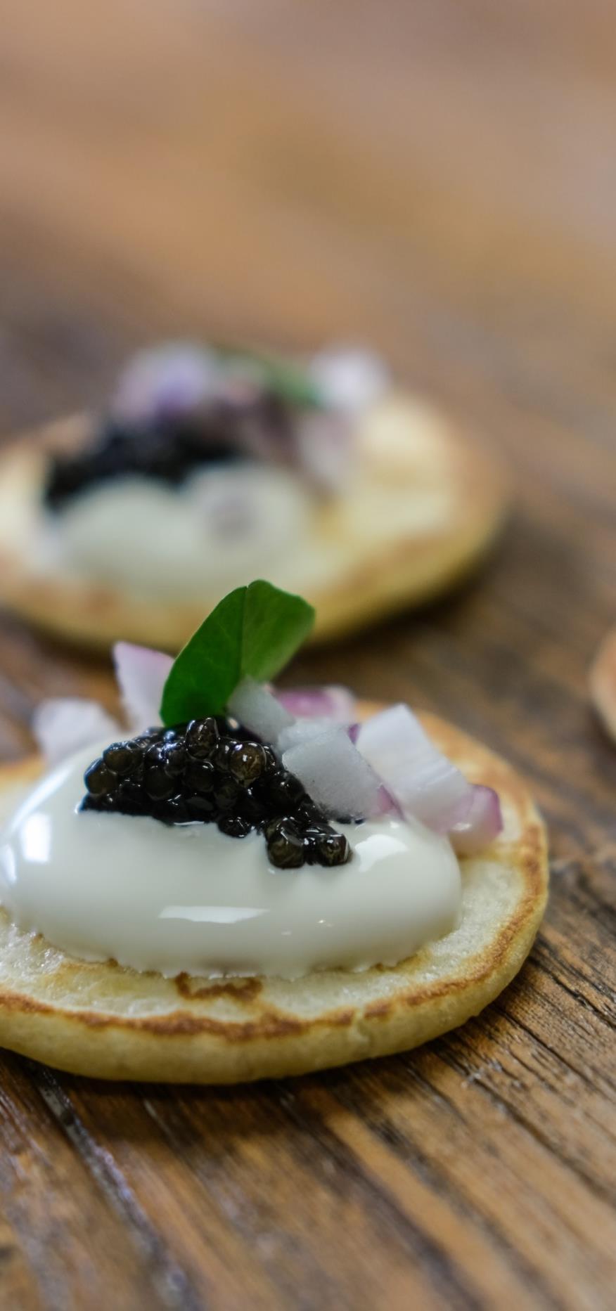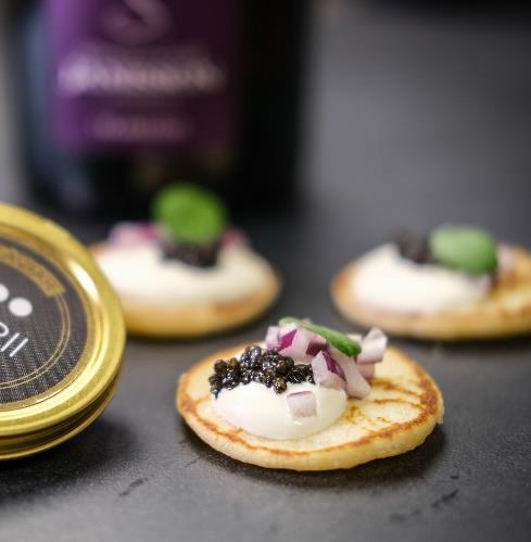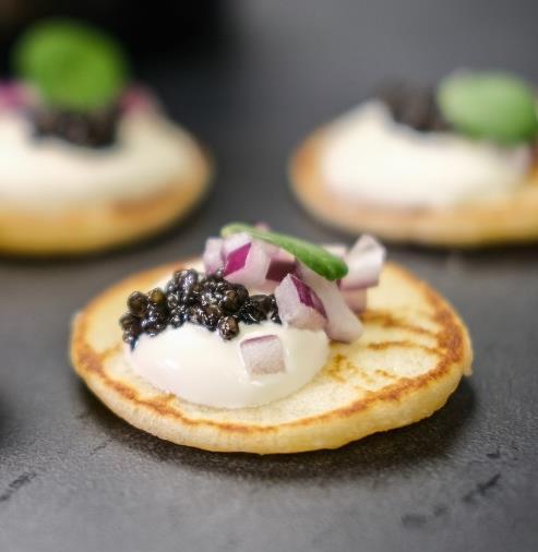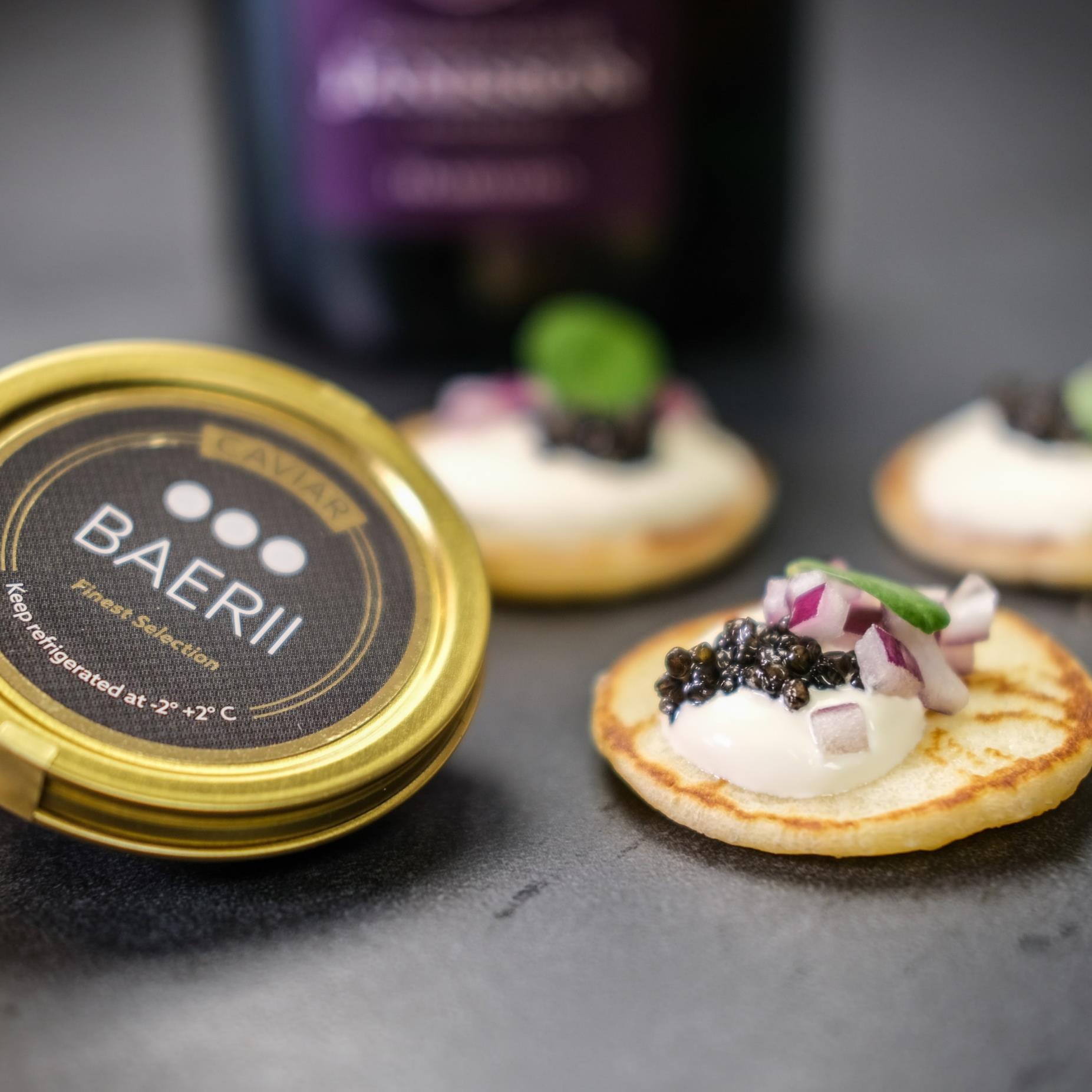 Bearii Caviar på blinis med creme fraice og rødløg