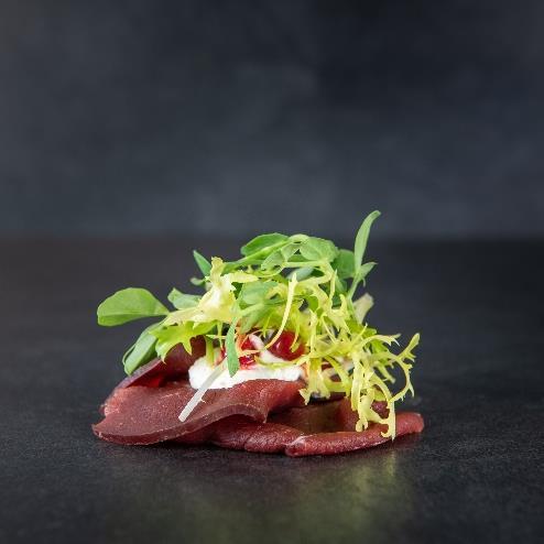 Røget hjortekød fra Rævhede Naturprodukter med peberrodscreme og ribs