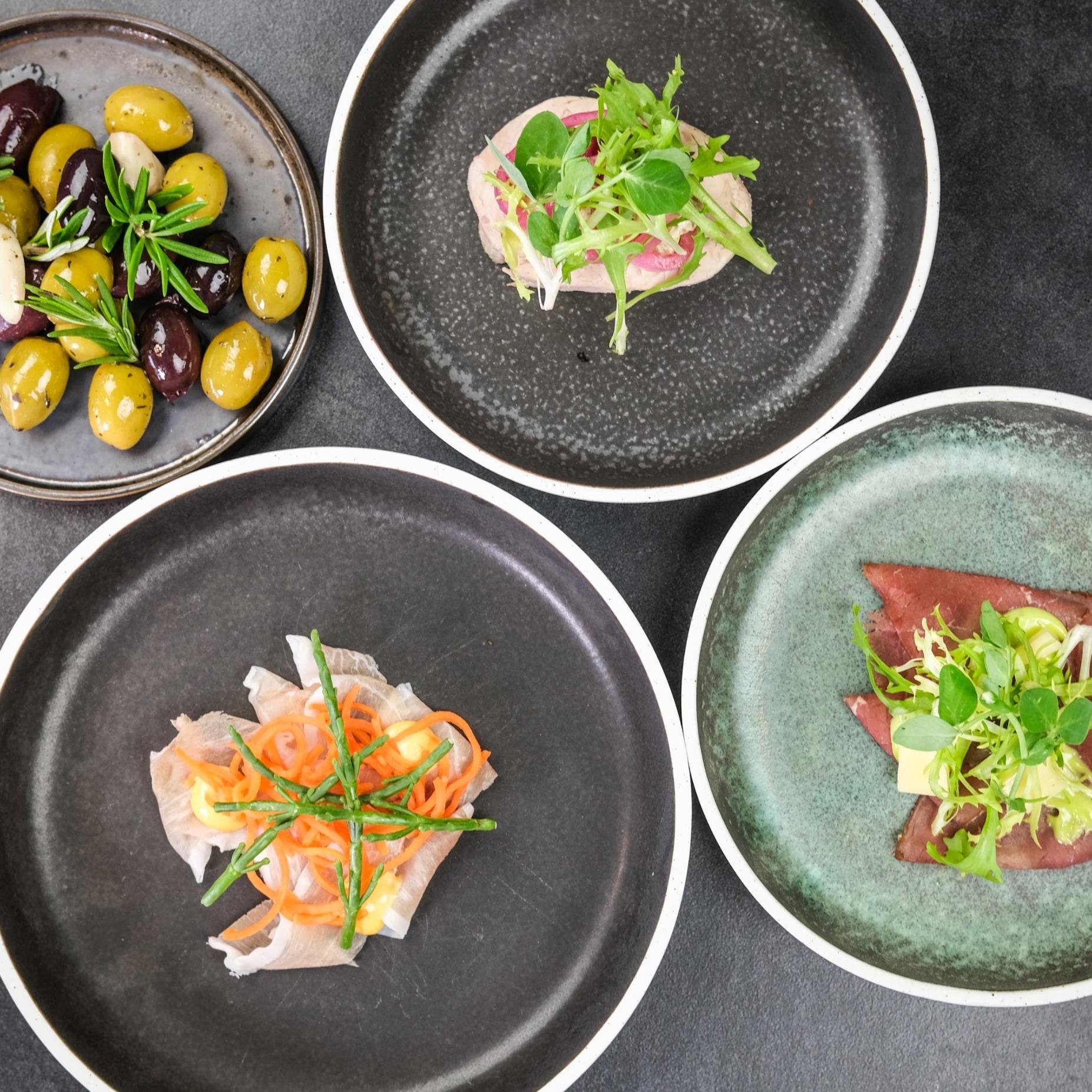 Ved bestilling af minimum 6 ens tapasretter til mindst 5 personer anretter vi på sorte engangsfade. Tapas bestillinger til mindre end 5 personer anrettes på vores tapas tallerkener enkeltvis.