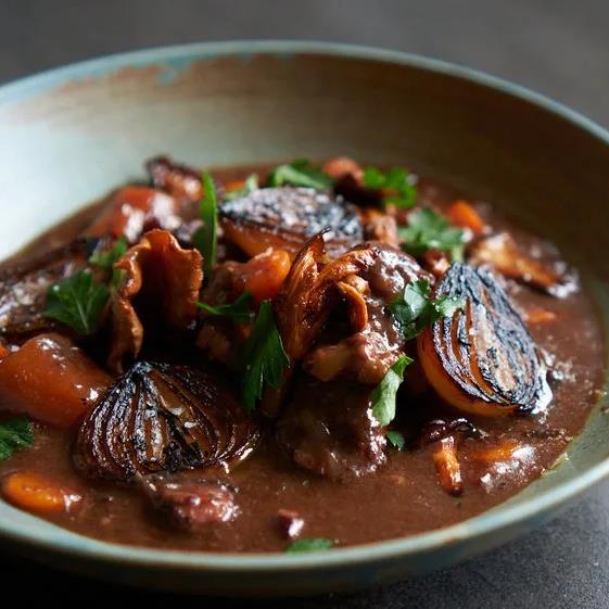 Filet Royal af tender pork med svampecreme og syltet rødløg