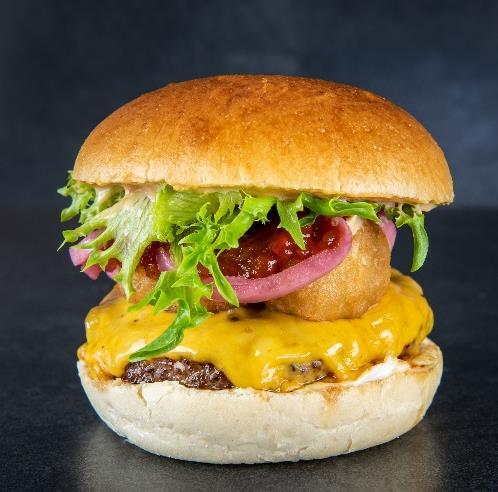 Himmerland bøf, spicy chili cheese tops, hvidløg- og chili mayo, hjemmesyltet rødløg, tomat relish, cheddar ost og salat.