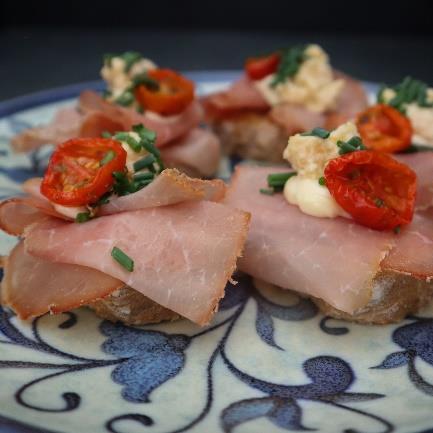 Skinkeinderlår fra Krastrupsøgaard, med æggestand, mayo, tomat og frisk purløg