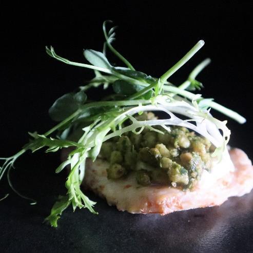 Røget oksetatar af røget okseinderlår fra Krastrúpsøgaard, kapers med bruchetta creme i smørbagt form.