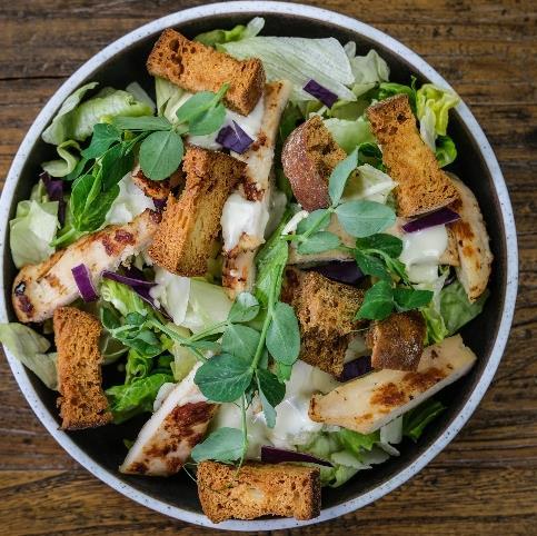 Kylling, Parmesan Reggiano, hjemmelavet brødcroutoner, salat og cæsar dressing