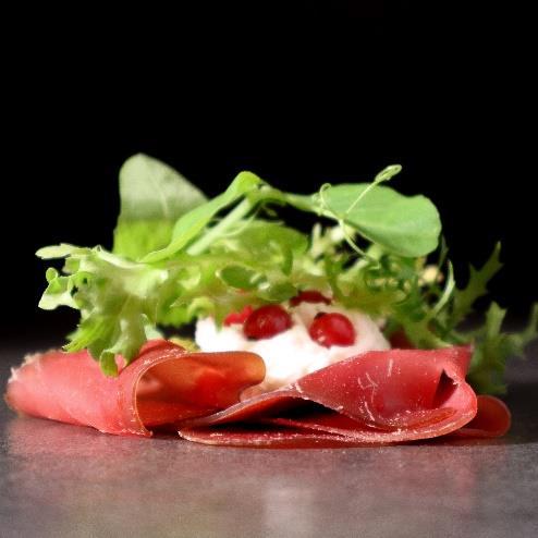 Røget okseinderlår fra Krastrupsøgaard med bruschetta mayo og grillet oliven