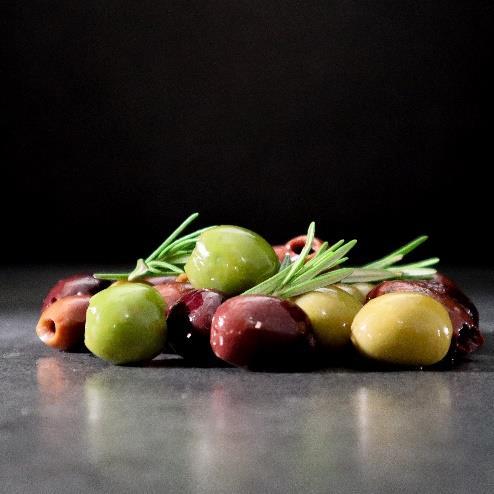 Sprøde flæskesvær fra Krastrupsøgaard Oliven mix, udvalgte oliven fra Italien