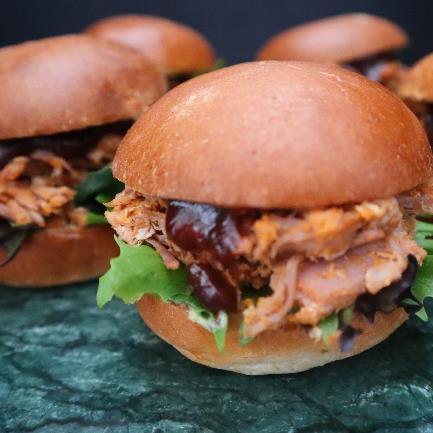 SLIDER med pulled pork af Dansk Bertels gris med BBQ sauce, sennepsmayo og hjemmesyltet agurk