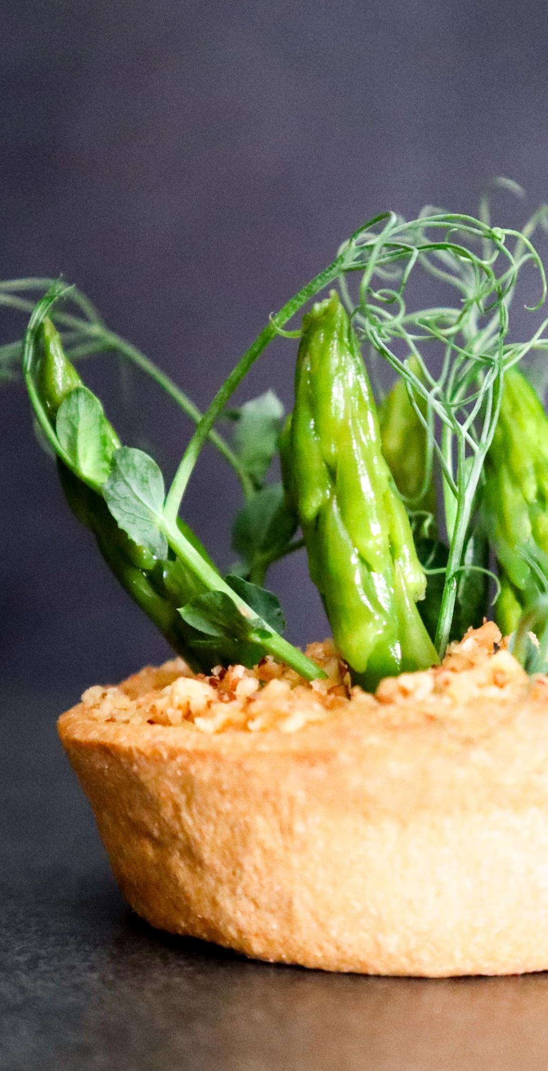 Urtehaven tærteform med bund af hjemmerørt humus, ristede Valencia mandler og grønne asparges