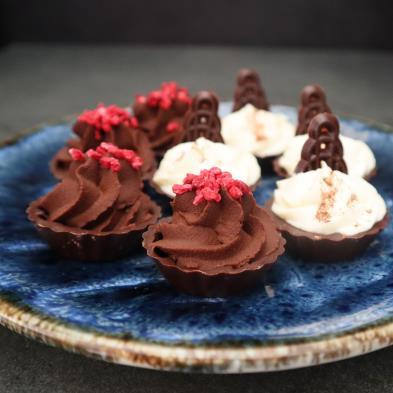 Dessert tallerken – Jordbær med fløde & hindbær Chokolademousse i chokolade skåle