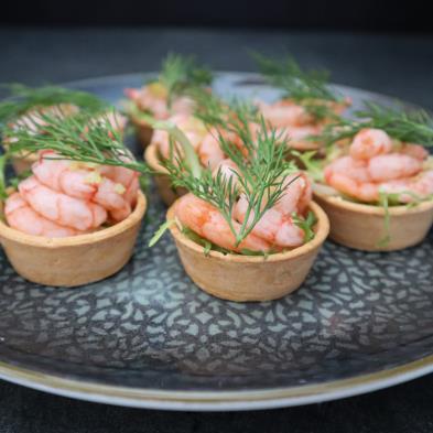 Håndpillede rejer fra Grønland på madpandekage, hjemmelavet dild mayo og citron støv
