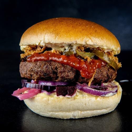 Vegansk bøf med BBQ dressing, vegansk mayo. purløg og kornblomster