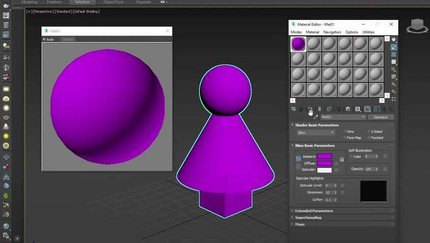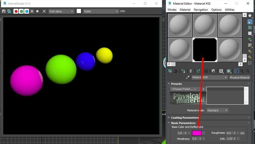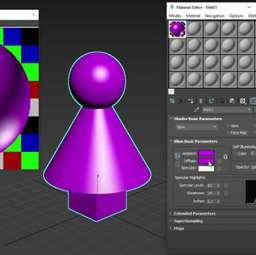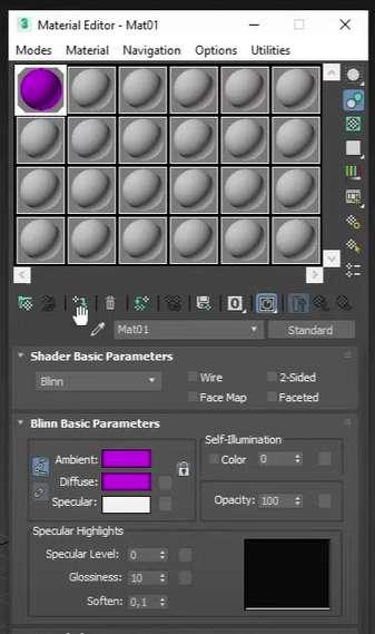 Opacidad: Controla la transparencia. Los materiales se encuentran en el Material Editor (Editor de materiales). Se puede acceder a él seleccionando un objeto en la escena y luego haciendo clic en el botón "Material Editor" en la barra de herramientas o utilizando el atajo de teclado "M". Ventana de materiales