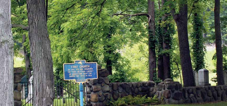 decorative iron fencing, one of which is for the Cleveland Family, one of the earliest settlers of the village. A large obelisk honors another early family – the Parishes. It is unknown how many interments exist in the cemetery due to the number of early settlers that were not marked with permanent markers.