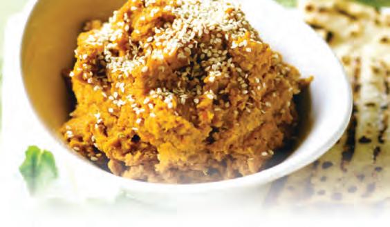 Hummus provides a delicious and healthy alternative to less nutritional dips. Versatile and available in various flavors, hummus can be whipped up at home for those who prefer to make their own dips. The following recipe for “Garbanzo-Carrot Hummus with Grilled Yogurt Flatbread” from James Campbell Caruso’s “España: Explore the Flavors of Spain” (Gibbs Smith) includes some Moroccan flavors that give this easy-toprepare recipe a truly unique taste.