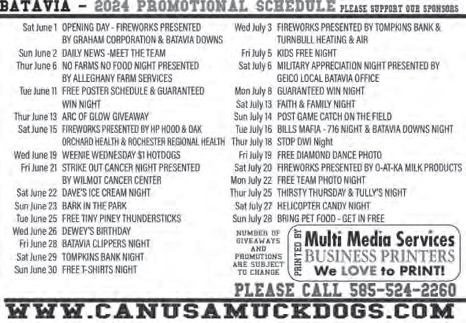 GENESEE VALLEY PENNY SAVER ● GVPENNYSAVER.COM 1-866-812-8111 Page6 BATAVIA EDITION ● FRIDAY,JUNE 14,2024 www.canusamuckdogs.com 585-524-2260 to get your single game tickets today! vs.Elmira JULY 2024 BRING THE WHOLE FAMILY to DWYER