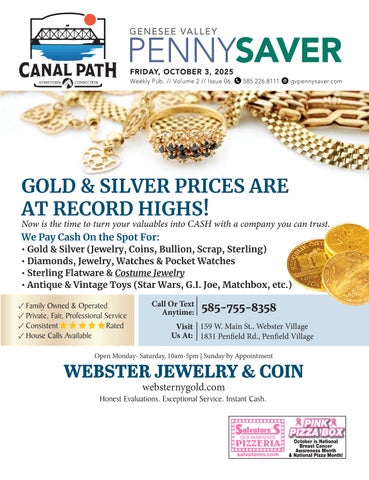 GENESEE VALLEY PENNY SAVER ● GVPENNYSAVER.COM 1-866-812-8111 Page3 DANSVILLE-WAYLAND EDITION ● FRIDAY,SEPTEMBER 2,2022 WNY Coin & Jewelry Buyers of NY coming to Dansville! Two Days Only • Fri. & Sat., Sept. 9 & 10 • 10am-5pm Highest Gold Buyer in Western New York We are the ONLY dealers that put the price of gold in our ads! PAYING TOP DOLLAR FOR GOLD! U.S. SILVER COINS 1964 AND OLDER Dimes - Quarters - Halves - Silver Dollars *1965-1969 Clad Halves Also TOP PRICES PAID FOR: Large Cents - Gold K. Rands - Coin Collections - Indian Cents - Commemorative Type Coins - Wheat Cents Halves - Silver Bars - Liberty Nickels - Mint Sets - Gold Bars - Buffalo Nickels - Proof Sets - American Gold Mercury Dimes - Franklin Mint Items - Eagles - Liberty Quarters – Canadian Coins Seated and Trade Liberty Halves - Foreign Coins - Dollars - U.S. Gold Coins o douad ERllars : Type Wheat Cheat Dansville American Legion • 36 Elizabeth St., Dansville, NY • (716) 803-5937 y Libe ns DON’T MISS THIS OPPORTUNITY! WE ARE BUYING ALL Our Buy Prices for Silver and Gold are at the highest they have ever been in over 25 years. Don’t miss this great opportunity! BUYING ALL GOLD! TOP PRICES PAID FOR ANYTHING GOLD: School Rings • Wedding Bands • Gold Chains • Gold Bars • Gold Teeth • Gold-Filled Eye Glass Frames • Gold Watches • Gold Scrap • Silver Certificates and Old Currency $1750 oz. WANTED: DEAD OR ALIVE BUYING ALL COSTUME JEWELRY TOP PRICES PAID FOR ANY COSTUME JEWELRY Pins, Necklaces, Pearls, Cameos, Rings, Beads, Garnets, Rhinestones, Glass & Plastic, Charms, Men’s Tie Clips & Cuff Links, QVC- Joan Rivers, Kirk’s Folly, etc. WELLLRY #4 - Silver Certificates (pre-1957)....................................up to .............. $2 & $5 Bills (pre-1966) ....................................................up to ............$10 Confederate......................................................................up to .........$500 Foreign..............................................................................up to .........$500 U.S. Paper Money Small Size Bills...................................up to .........$500 U.S. Large Size Bills..........................................................up to .....$5,000 Obsolete Paper Money and Stock & Bonds ...................up to ......... $250 Fractional Currency ..........................................................up to ......... $100 Currency with Bank Names .............................................up to .....$5,000 “Urgently Needed: Canadian Notes Before 1954” PAPER MONEY $3 1954” Pay Up To For The Following: WANTED: ALL SILVERWARE!! Buying All Sterling Alvin, Gorham, Lunt, Reed & Barton, Towle & Wallace Paying a premium for Tiffany & Jensen Will buy All Coin Silver and Foreign Made Silver Sterling Trophies Sterling Tea Sets • Large Trays • Punch Bowls • Pitchers • Silverware HIGHEST PRICES PAID FOR SILVERFANCY Canadian Dimes Through Dollars - 10, 25, 50, 1.00 COINS (1968 & Prior) Mercury Dimes, Roosevelt Dimes (1964 & Prior) All Barbers Franklin & Walking Liberty & Washington Quarters (1964 & Prior) Need All Kennedy Halves (1970 & Prior) No appointmentsneeded! Fully licensed in Erie County BUYING ANY WRIST OR POCKET WATCHES BRING IN ANY WATCHES, RUNNING OR NOT!