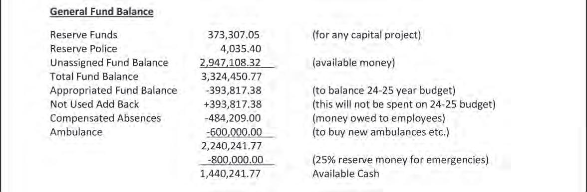 A er our last budget meeting there are a few points that require clarification. Being on the board one should have an understanding of the budget. Yet there seems to be some difficulty comprehending fund balance (savings account). To address the misconception that the village is broke: is is not true. Our general fund has gone from 2.2 million in Jan 2023, to 2.6 million in Jan 2024, to 3.3 million in Jan 2025. is information is available on the village website: www.dansvilleny.us under financial reports.