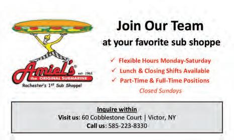 join our hive! EOE. Apply in person or online at: barkmanhoney.com/contact/careers 7871 Lehigh Crossing, Victor, NY 14564 Join Our Team at your favorite sub shoppe Inquire within Visit us: 60 Cobblestone Court • Victor, NY Call Us: 585-223-8330 • Flexible hours Monday-Saturday • Lunch & Closing Shifts Available • Part-Time & Full-Time Positions Closed Sundays APPLY ONLINE TODAY! PRSRT STD. US Postage PAID Permit #43 Pittsford, NY