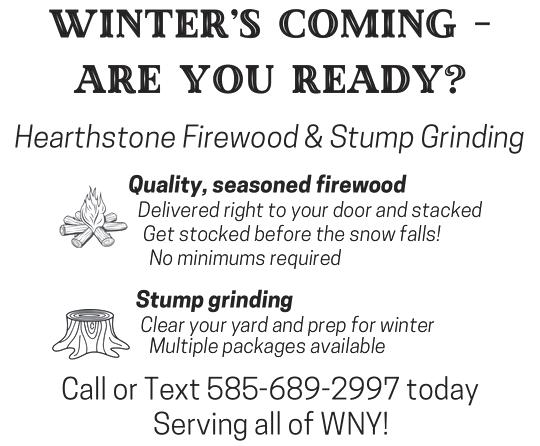 TREESERVICE: Trimming. Completeremoval.30yearsexperience. Verycompetitiveprices.Now availableSTUMPGRINDING!Free estimates.Fullyinsured. 585-346-0352.