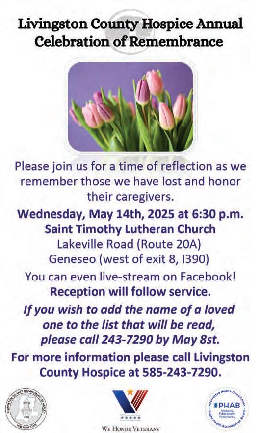 GoodMourningGeneseo- Afree, informalmorningcoffeehourdedicatedtoprovidingencouragementfor thoseexperiencinggrief.Sometimesit helpstojoinotherswhoareworking throughaloss.Benefitfromthe supportivecompanyofothers,share memories/challenges,andenjoylight refreshments.Heldat9:00amonthe secondWednesdayofthemonthin theClubhouseattheHammocks.All arewelcome!4270HammocksDr. Geneseo.SponsoredbySt.Michael’s EpiscopalChurch,Geneseo.Email office@stmikesgeneseo.orgtojoin.