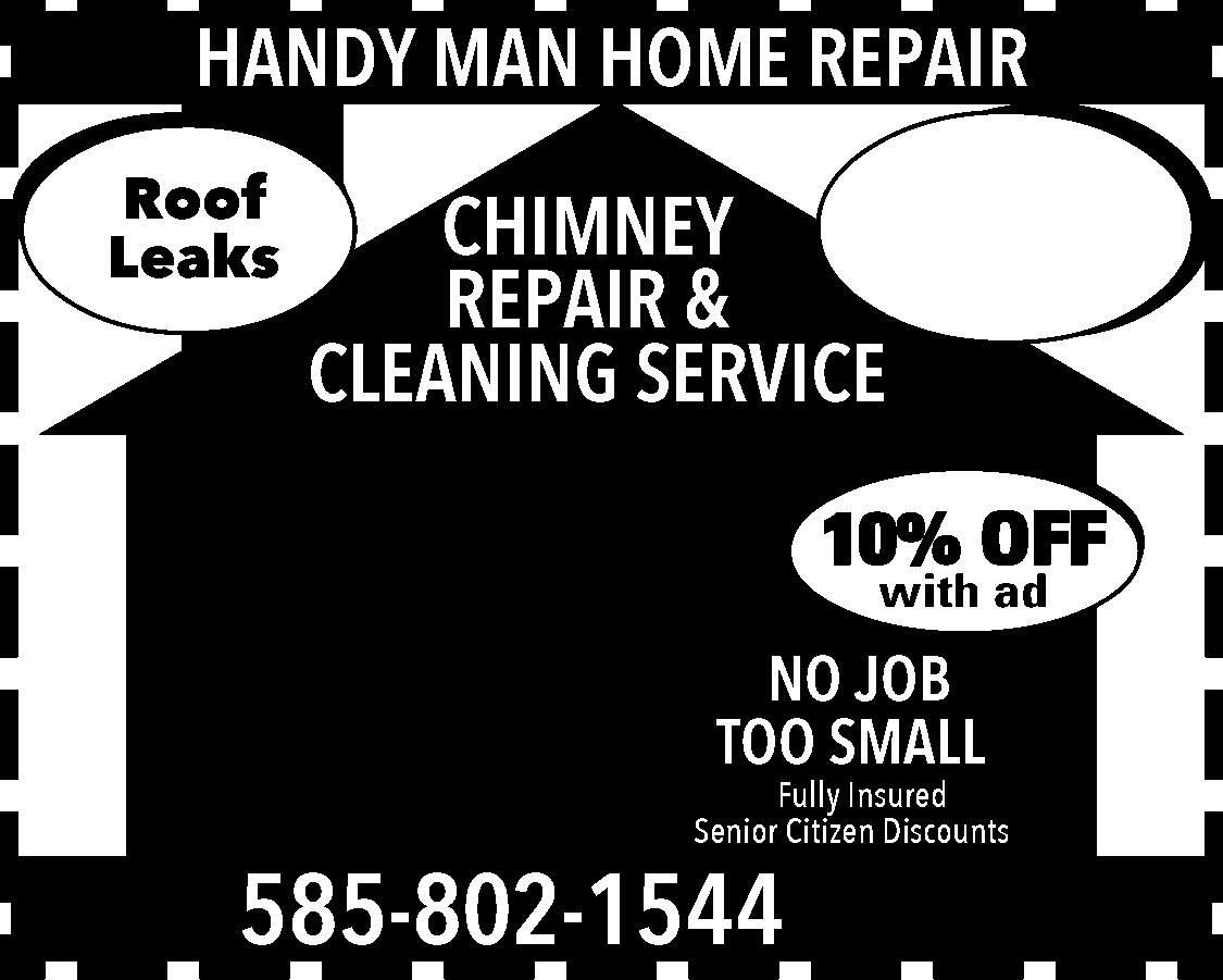 HANDYMANSERVICES: Multiskilledcraftsman Nojobtoosmall! Mostanytypeofhomerepairs Specializingplumbing,electrical, Doors,windowsProfessionalInstallations/Repairs. Powerwashingdecksandsiding Fair,Reasonable,Reliable LETMEKNOW WHATYOUNEED! RetiredCivilEngineer Tony,585-233-8007