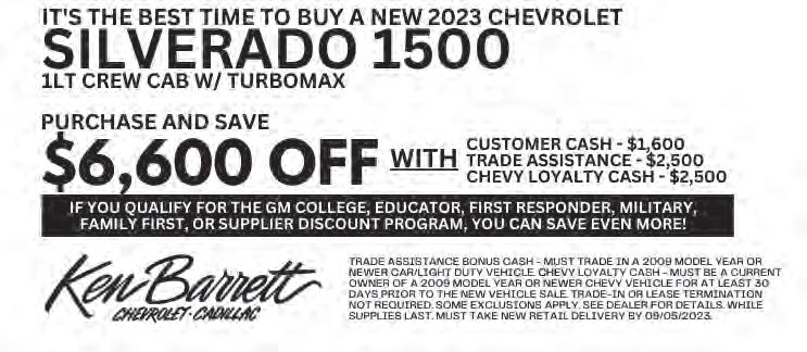 585.226.8111 | GVPENNYSAVER.COM A publication of featured MEDIA Jim Barnard Chevrolet HOT SUMMER SAVINGS AT Parts & Service Hours: Mon.-Fri. 7:30am-5:30pm Sales Dept. Hours: Mon., Tues. & Thurs. 8:30am-7pm Wed. & Fri. 8:30am-5:00pm; Sat. 9am-3pm Or Make An Appointment Jim Barnard Chevrolet 7101 Bu alo Rd. (Rt. 33), Churchville, NY (585) 293-2120 View more on barnardchevy.com Must take delivery by 8/31/23.. Prior sales excluded. All prices are plus tax, title, lic & reg. Advertised vehicles may be subject to open safety recalls. Go to safecar.gov or contact dealer for more info. *Length of contract limited and varies by model. Must nance with GM Financial. Some customers may not qualify. Not available with some other o ers. Must take delivery by 8/31/23. ‘21 Blazer RS #23T049A, 38,456 mi., AWD, leather, remote start Sale Price $36,936 ‘21 Tundra Limited #23T069A, 37,853 mi., 4WD, V-8 engine, stability control Sale Price $49,937 ‘18 GMC Terrain Denali #4365, 50k mi., remote start, sun/moonroof Sale Price $26,949 ‘20 Trax LT #4847, 29k mi., FWD, turbo charged engine Sale Price $19,929 ‘21 Kia Seltos LX #23T217A, 24k mi., AWD, very clean! Sale Price $21,824 ‘19 Equinox LT AWD #23T220A, 40k mi., Bluetooth, remote start Sale Price $22,939 ‘16 Silverado 1500 LT #22T383A, dbl. cab, 4WD, 128,170 mi., nav. Sale Price $21, 912 ‘17 Escape Titanium #4877A, 1.5L EcoBoost, 51,961 mi. Sale Price $17,951 ‘20 Buick Encore GX #4867, 46k mi., AWD, rear camera, preferred, turbo charged engine Sale Price $20,946 ‘19 Ram 1500 SLT #4818C, 59k mi., Classic, Crew Cab, Running Boards, rear cam Sale Price $28,459 ‘20 Kia Sportage LX #23T153A, 68k mi., 1 owner! Sale Price $18,867 ‘18 Equinox LT FWD #23T195A, 83k mi., sunroof, heated seats Sale Price $14,982