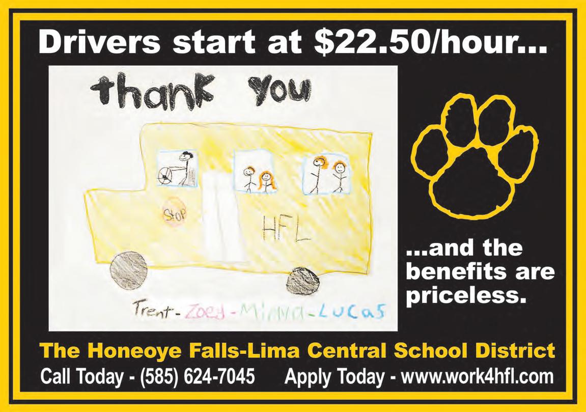 innovative marketing solutions to enhance and support businesses through advertising, design, digital, printing and promotional products. Full-time Customer Service Member We’re Hiring! RNs, LPNs and CNAs needed to join our team and make a di erence in the lives of our residents. • Enhanced Sign-On Bonuses • Competitive rates based on experience. • Shi di erentials and exible scheduling o ered Please send your resume to Kim Danzig at kdanzig@hurlbutcare.com Come Join our Winning Team! Hurlbutcare.com NURSING FACILTY A Hurlbut™ Care Community Conesus Lake Nursing Home 6131 Big Tree Rd., Livonia, NY 585-346-3001 Avon Nursing Home 215 Clinton St., Avon, NY 585-226-2225 Just a short drive from Henrietta, Mt.