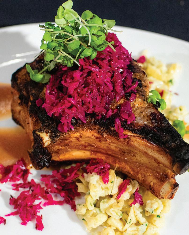 Chef Corey highly recommends Char’s Pork Chop Façon Grand-mere, a double bone Rosenkrans chop with spaetzle, brandy-soaked apple purée, and pickled red cabbage, inspired by a Hubert Keller dish.