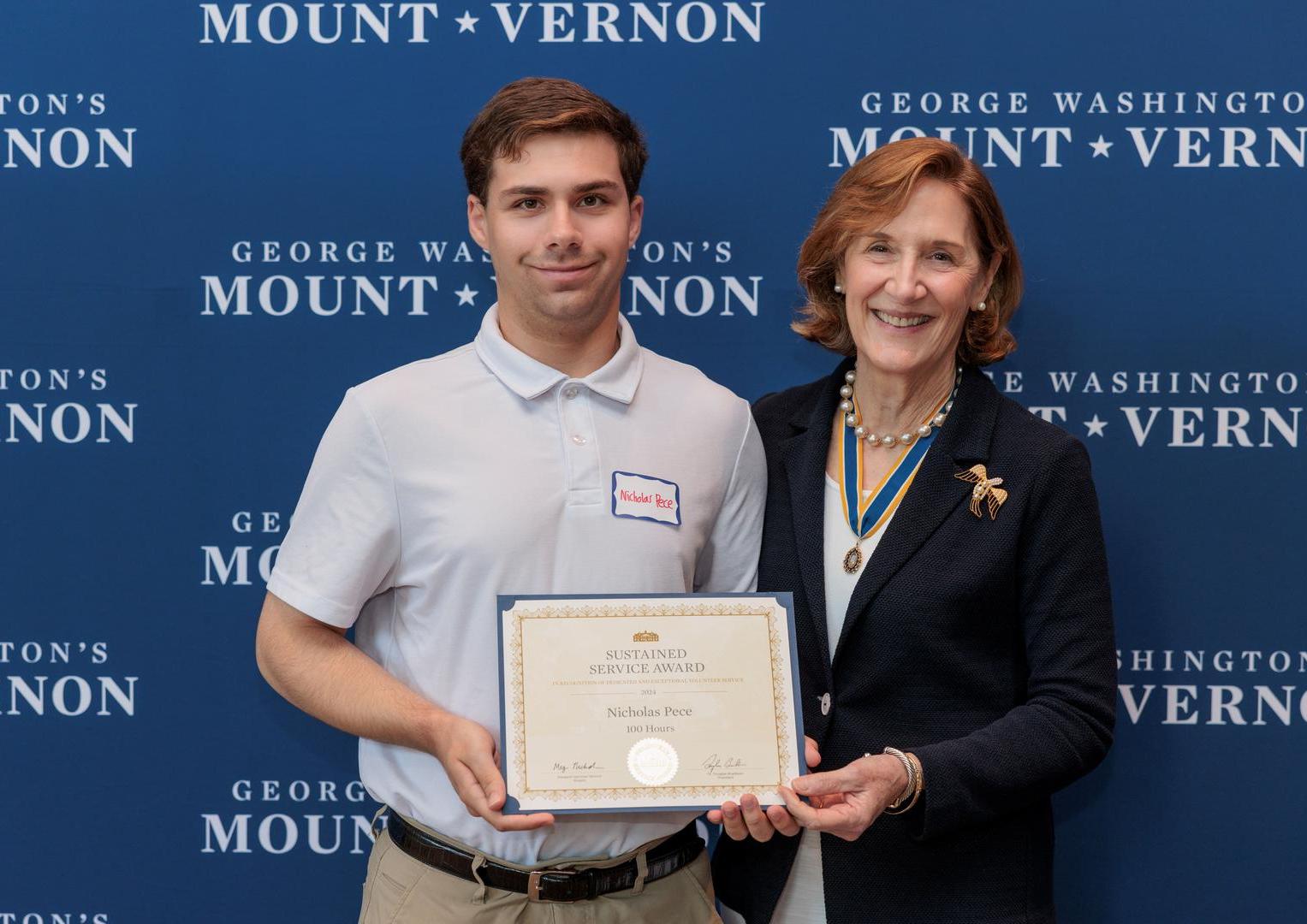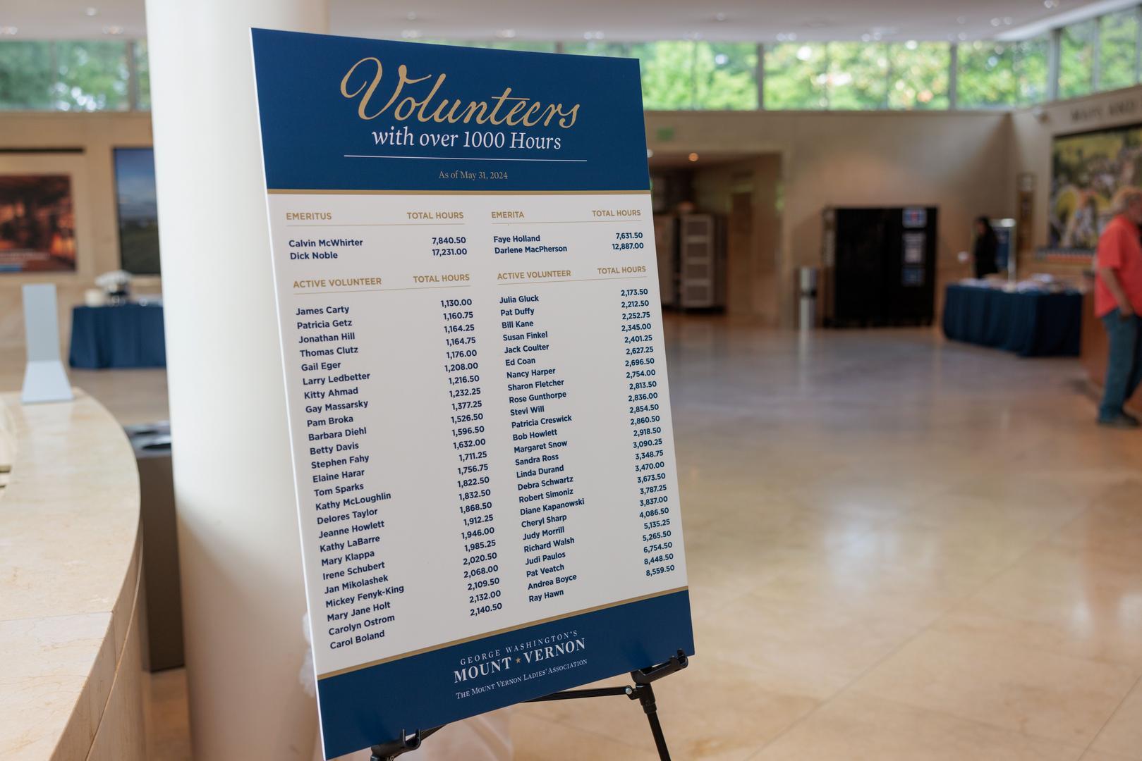 In 2024, we recognized 34 volunteers with 100 up to 5,000 service hours Dr Doug Bradburn, President and CEO, could not attend in person but sent his warmest thanks in a recorded message and led Mount Vernon volunteers in huzzahs. Volunteers also paid tribute to and gave a standing ovation to the 23rd Regent of the Mount Vernon Ladies' Association, Margaret Hartman Nichols, as her tenure as Regent ended in 2024.