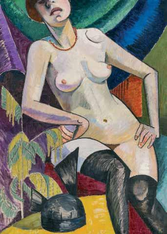 I Kvinneakt med sorte strømper 1913-14 har Røed Lærum valgt et mer organisk formspråk, med en sterkere plastisk kvinnekropp. Kroppens volum forsterkes av komposisjonenes