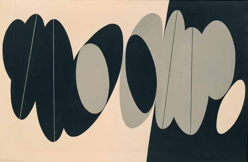 Av hans senere ting har jeg særlig festet meg ved nr. 17 og 20 med sine blå runde former innfattet i andre farvekomplekser av omtrent samme form, slik at det virker som forskyvninger av de samme former i forskjellige plan. Dette gir en rytmisk impuls som får hele billedflaten til å leve. I andre bilder bygger han mer på en rytmisk forskyvning av samme form som en serie bortover billedflaten, som i nr. 22. Her holder han seg også strengt til valører i grått og svart mot hvitt. En liknende form har Nasjonalgalleriets innkjøp, nr. 21. Men her er farven tatt i bruk for å skape en rytmisk serie på det koloristiske plan. Faktisk minner dette maleriet meg om noe i tidens serielle musikk, hvor man ofte finner et subtilt samspill av serier på forskjellige plan.