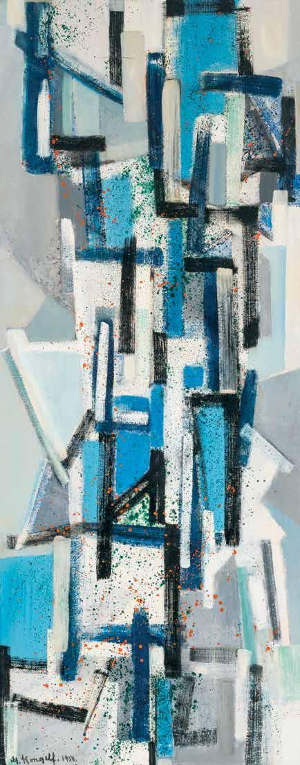 Signert og datert nede t.v.: G. Kongelf. 1958. Signert og påtegnet på baksiden av lerretet: “Kr. 1500- Gudrun Kongelf.”