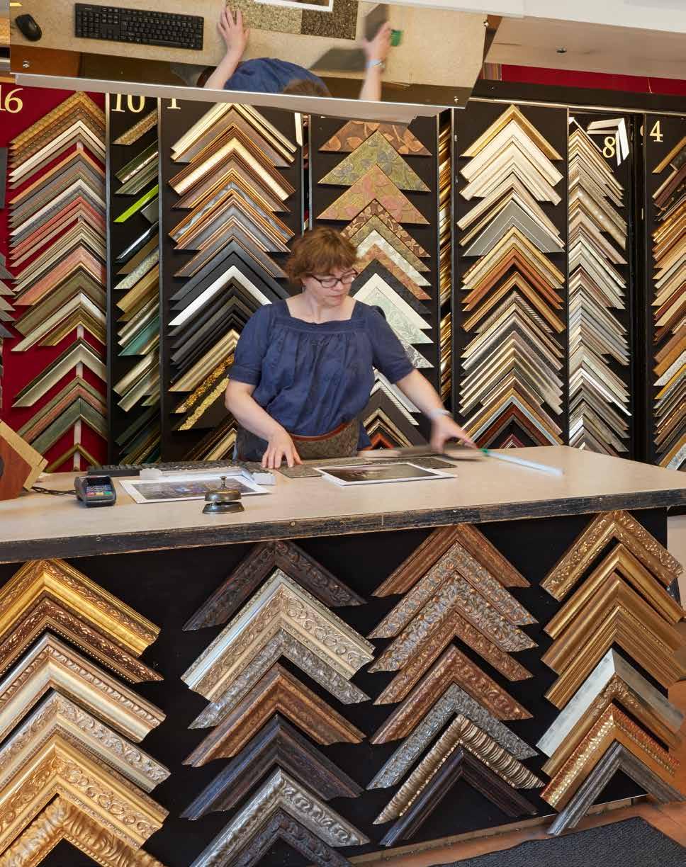 Er kunden vanligvis bestemt på rammevalget, eller overlates det ofte til deg? Det er ingen regler for rammer. Personlig smak avgjør, men kundene har en tendens til å like det andre liker. På 1970-tallet var det mye kalkede eikerammer, på 80- og begynnelsen av 90-tallet var det gull på alt, så kom sølv, varmt sølv, sort, hvit, eik. Slike tydelige trender gjelder særlig i Norge. Men det finnes også masse nydelige, håndlagde rammer. De drar jeg sydover i Europa for å finne. Leverandørene jeg da møter er gjerne familiebedrifter som har drevet med håndlagde rammer i generasjoner. Mange eldre, håndlagde rammer, ofte med mye gull og ornamentikk, passer ikke dagens smak. Jeg ser med en gang om en gammel ramme er spesiallaget til akkurat dette bildet. Da anbefaler jeg at man tar vare på den originale rammen, hvis den ikke er helt ødelagt. Det er ofte kostbart å restaurere gamle rammer, men som sagt er mitt syn at den originale rammen bør følge bildet.