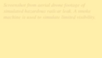 Screenshot from aerial drone footage of simulated hazardous railcar leak. A smoke machine is used to simulate limited visibility.