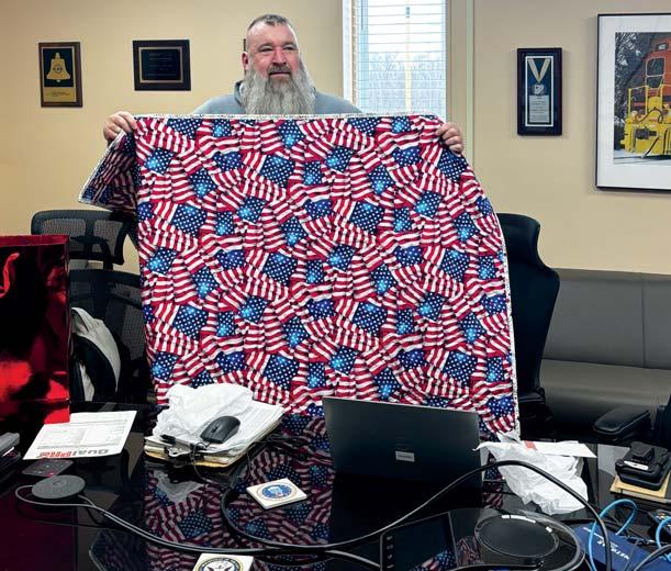 Ohio Central Railroad (OHCR) Roadmaster Jason Babcock shows off his quilt.