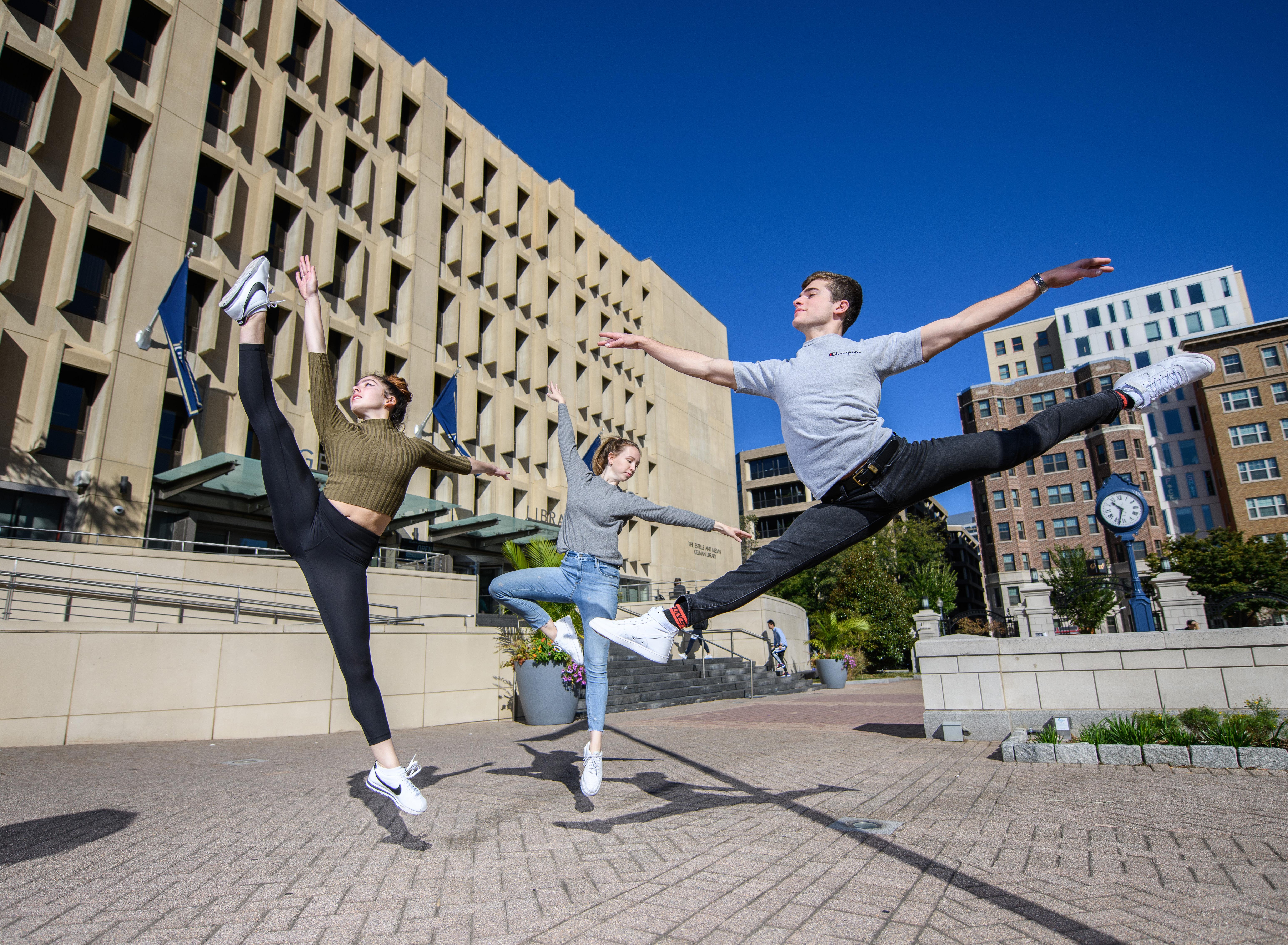 Katie Auerswald (‘21), Sophia Young (‘23), and Aaron Mancus (‘22) make Kogan Plaza their stage.