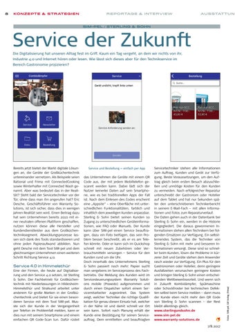 Servicetechniker stehen alle Informationen zum Auftrag, Kunden und Gerät zur Verfügung. Beste Voraussetzungen, um den Auftrag gleich beim ersten Besuch abzuschließen und unnötige Kosten für den Kunden zu vermeiden. Nach erfolgreicher Reparatur unterschreibt der Gastronom oder Hotelier auf dem Tablet und hat nur Sekunden später den unterschriebenen Technikerbericht in seinem E-Mail-Fach – mit allen Informationen und Fotos zum Reparaturverlauf. Die Daten gehen auch in der Datenbank bei Sterling & Sohn ein, werden in die Historie eingegliedert. Die daraus gewonnenen Informationen stehen allen Technikern bei folgenden Einsätzen zur Verfügung. Ein selbstlernendes System, das die Techniker von Sterling & Sohn mit mehr und besseren Informationen versorgt. Diese sind so schneller beim Kunden, lösen die Probleme in kürzerer Zeit und Geräte stehen dem Anwender rasch wieder zur Verfügung. Ein Plus für den Gastronomen oder Hotelier, denn geringere Ausfallzeiten verursachen geringere Kosten und bringen Sterling & Sohn einen entscheidenden Wettbewerbsvorteil. Und wenn sich in Zukunft Kombidämpfer, Spülmaschine oder Schockfroster bei technischen Defekten selbst beim Service melden – dann muss der Kunde eben nicht mehr den QR Code von Sterling & Sohn scannen – der Rest bleibt allerdings gleich. www.sterlingundsohn.de www.sim-pel.de www.warranty-solutions.de 7/8.2017