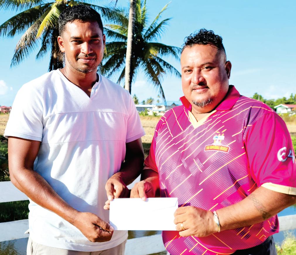 Vice-President of the Essequibo Cricket Board Norwayne Fredricks (left) collects the financial support from Chief Executive Officer of FL Sport, John Ramsingh.