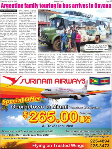 driving, without going by boat to Colombia...But it was so expensive for the bus to cross too.” Overwhelmed by some level of frustration, the couple decided to head to Venezuela and was forced to remain there for the longest period yet, since their bus developed some mechanical (Continued on page 18)