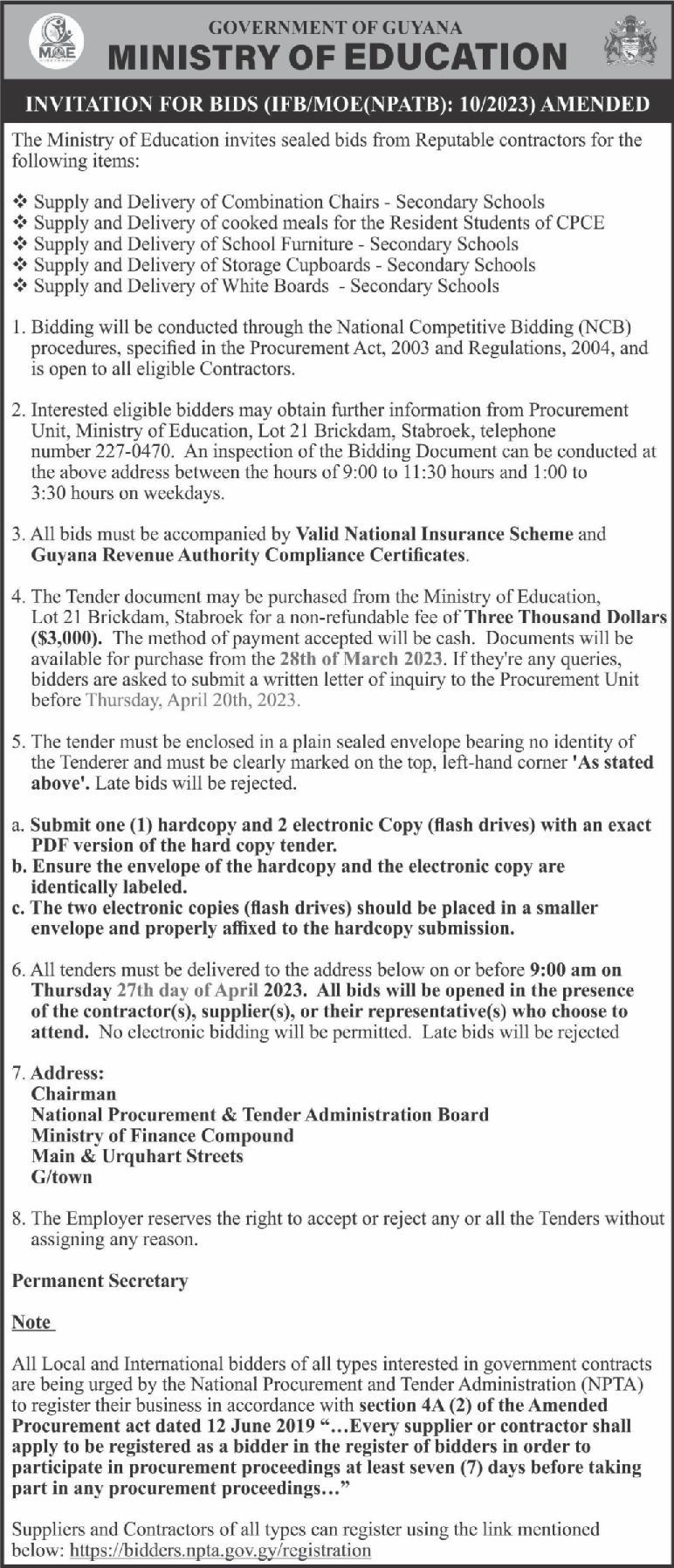 Office, during normal workinghours.Allbidsmust be deposited in the tender box at the National Procurement and Tender Administration Board, Ministry of Finance, Main and Urquhart Streets, Georgetown no later than 9:00amonTuesday,May9, 2023.