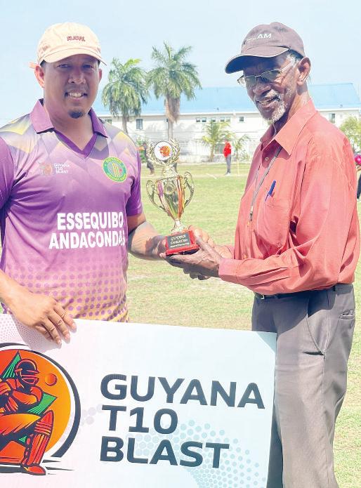 The former Guyana and Windies U19 star Isai limited overs batsman Thorne who had 1-15, clobbered 7 sixes and one 4 alongside spinner Totaram while Raymond Perez (15) Bishun(1-11). and Ushadeva Balgobin (11) Demerara were kept to gotintodoublefigures. 95-6 by the end of their 10 Keon Sinclair (2-19) overs Captain Akshaya escaped the punishment Persaudledwithaclassy19while off-spinner Junior ball 32 (3x4 2x6). David Sinclair and veteran seamer Williams also hit three fours Chris Barnwell returned a and a pair of sixes in his 29 wicket apiece. The Pitbulls off 17, but no other player were then strangled by the offeredassistance. Anacondaswhokeptthemto Veteran spinner and at the Meten-Meer-Zorg 72 all out despite efforts skipper Veerasammy Ground with the Essequibo from skipper Barnwell Permaul finished off the Jaguars playing their county (21*), Justin Sinclair, Leon match nicely for his team m a t e s , E s s e q u i b o Swamy and Jeremiah Scott with figures of 2-16 with Anacondasfrom12:00h. whoallhad11runseach. former Guyana T20 player Match 2 will see the Fast-bowler Qumar Rajiv Ivan chipping in with PitbullsbattlingthePiranhas Torringtonstarredwith3-15, 2-7. from14:30h. while Kwesi Mickle Round 4 continues today