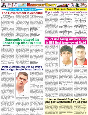No. 71 and Young Warriors clash in NBS Final tomorrow at No.69 After e n d u r i n g t w o rainy seasons and the beginning of a third, at long last, the 2013 New Building Society Second Division 40-Over Cricket Competition, w h i c h h a d over one hundred participating teams, will be reaching its climax tomorrow when the final is scheduled to be run off at the No.69 Village Ground. Clashing for the title will be Young Warriors of Cumberland East Canje and No.71 of the Upper Corentyne area, both evenly balanced teams having shown much resilience by not losing a match so far in the round robin competition which was played in sixteen zones. The Young Warriors batting will depend heavily on their former Guyana under-15 and Berbice under-19 cricketer, Kevin Ramdeen, who has so far registered a century and two half centuries in the competition. The only other half centurion in the team is former Berbice under-19 cricketer, Ishwar Singh, but others such as Mortimer Fraser, Sanjay Khan, Rudolph Baker, Anil Beharry and Berbice under17 all-rounder Kassim Khan and veteran Hubern Evans have contributed consistently. T h e Yo u n g Wa r r i o r s